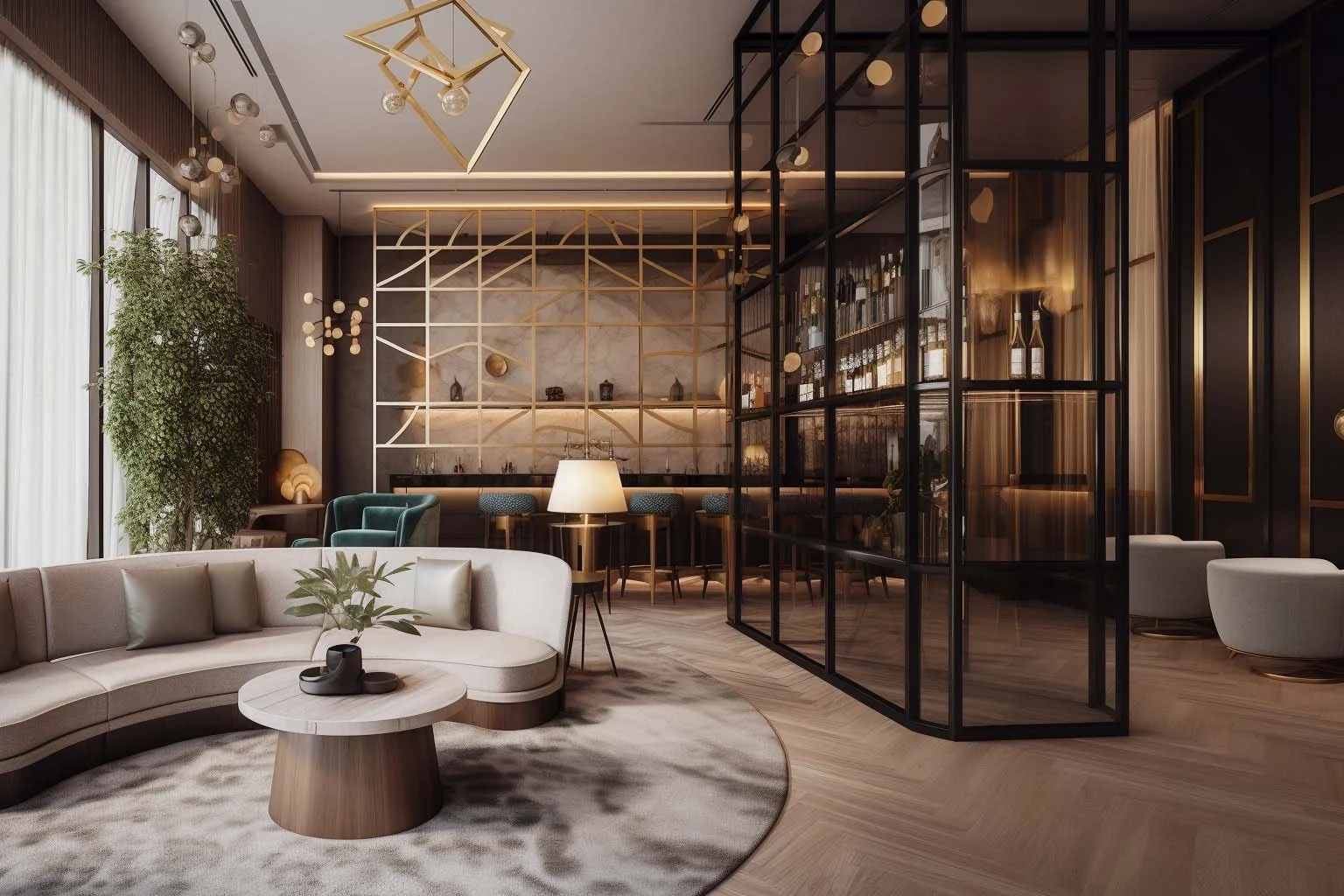 From the moment guests step into the welcoming lobby, they are enveloped in an atmosphere of timeless sophistication. The reception area, adorned with an imposing desk of polished white marble, exudes an aura of refinement and luxury. Additionally, a golden-paneled wall behind the desk bathes the area in a warm, inviting glow, offering a radiant welcome to all who enter. Plush seating arrangements, including semi-circular sofas that create pockets of comfort and relaxation throughout the space.
